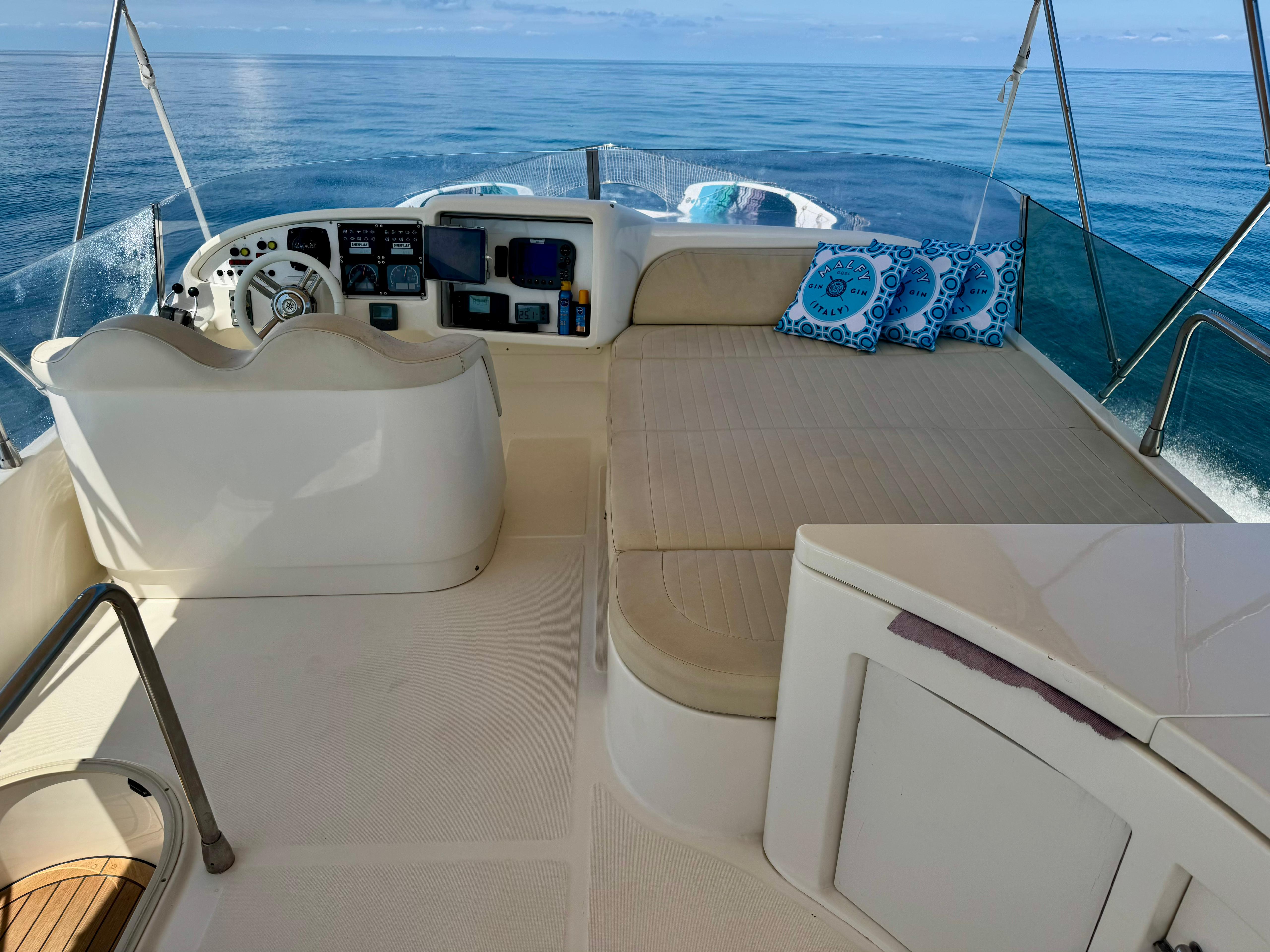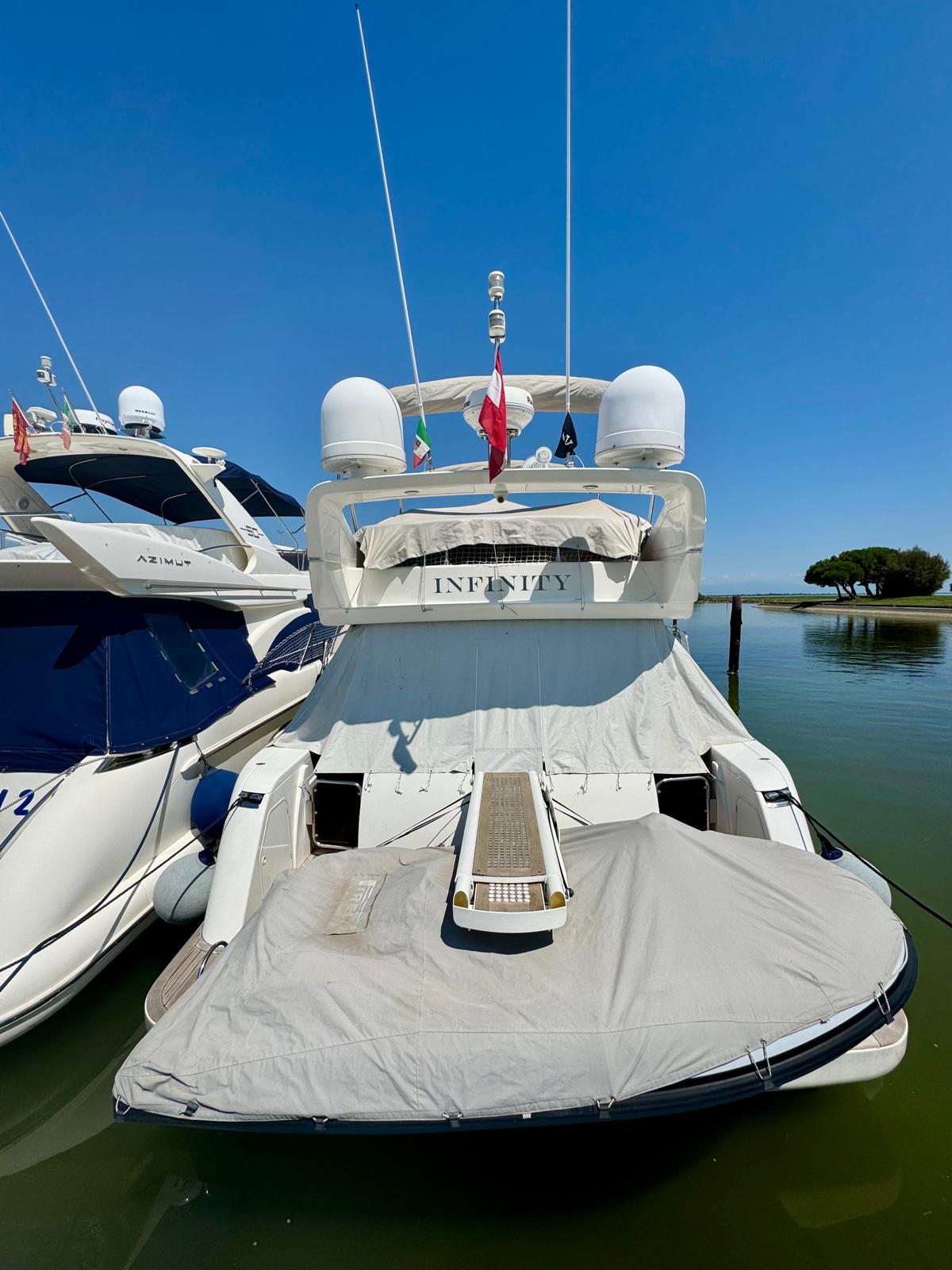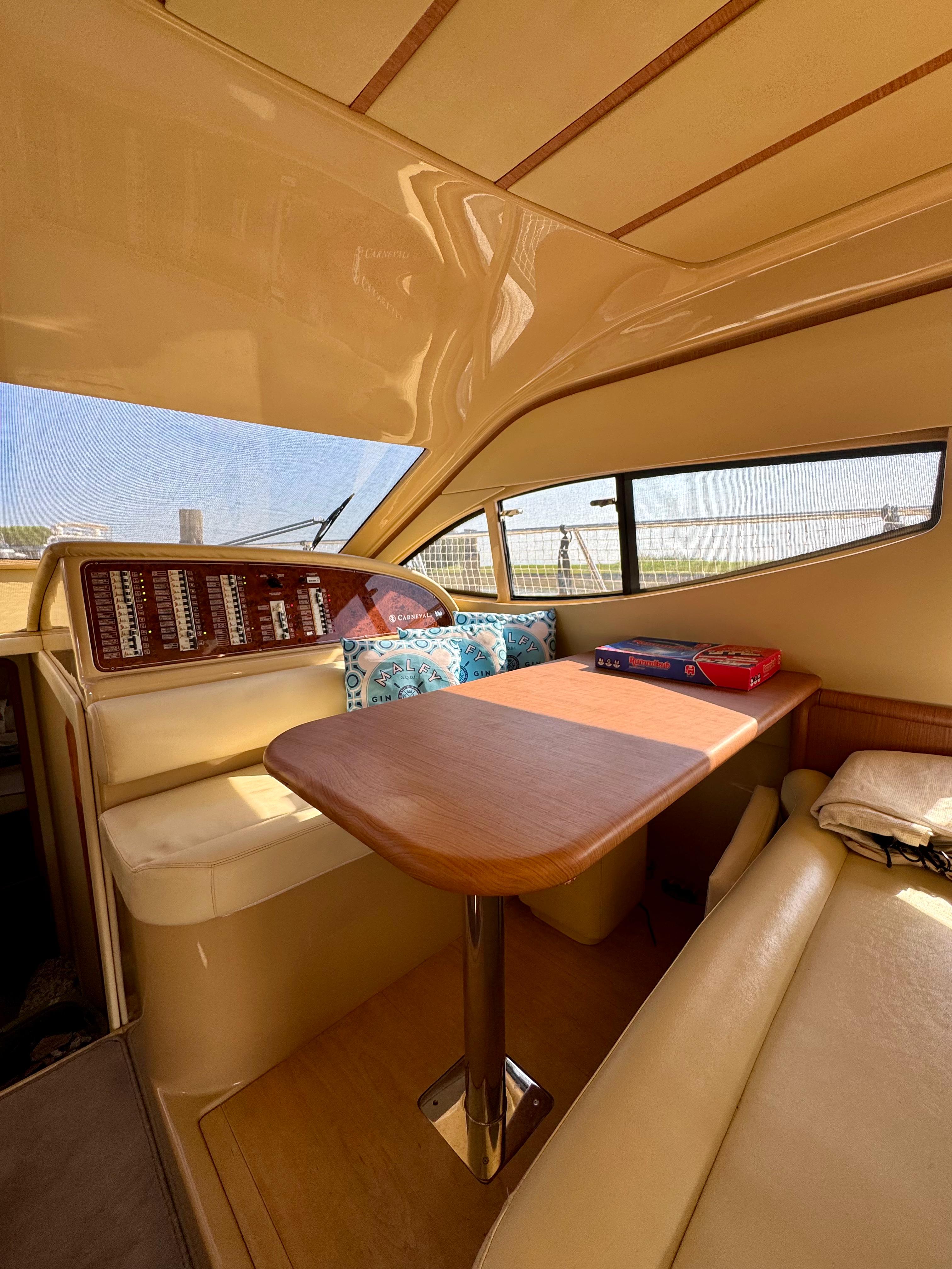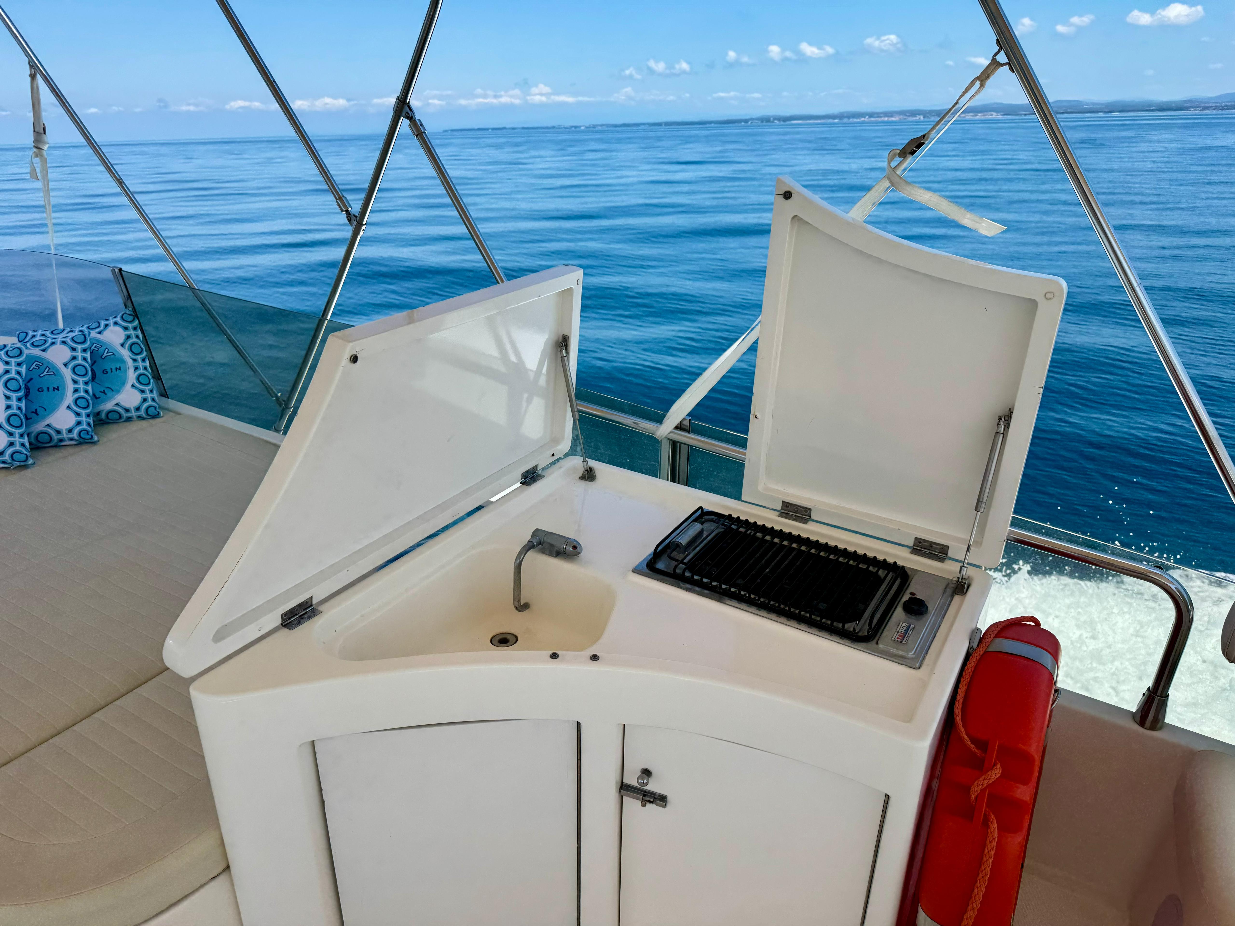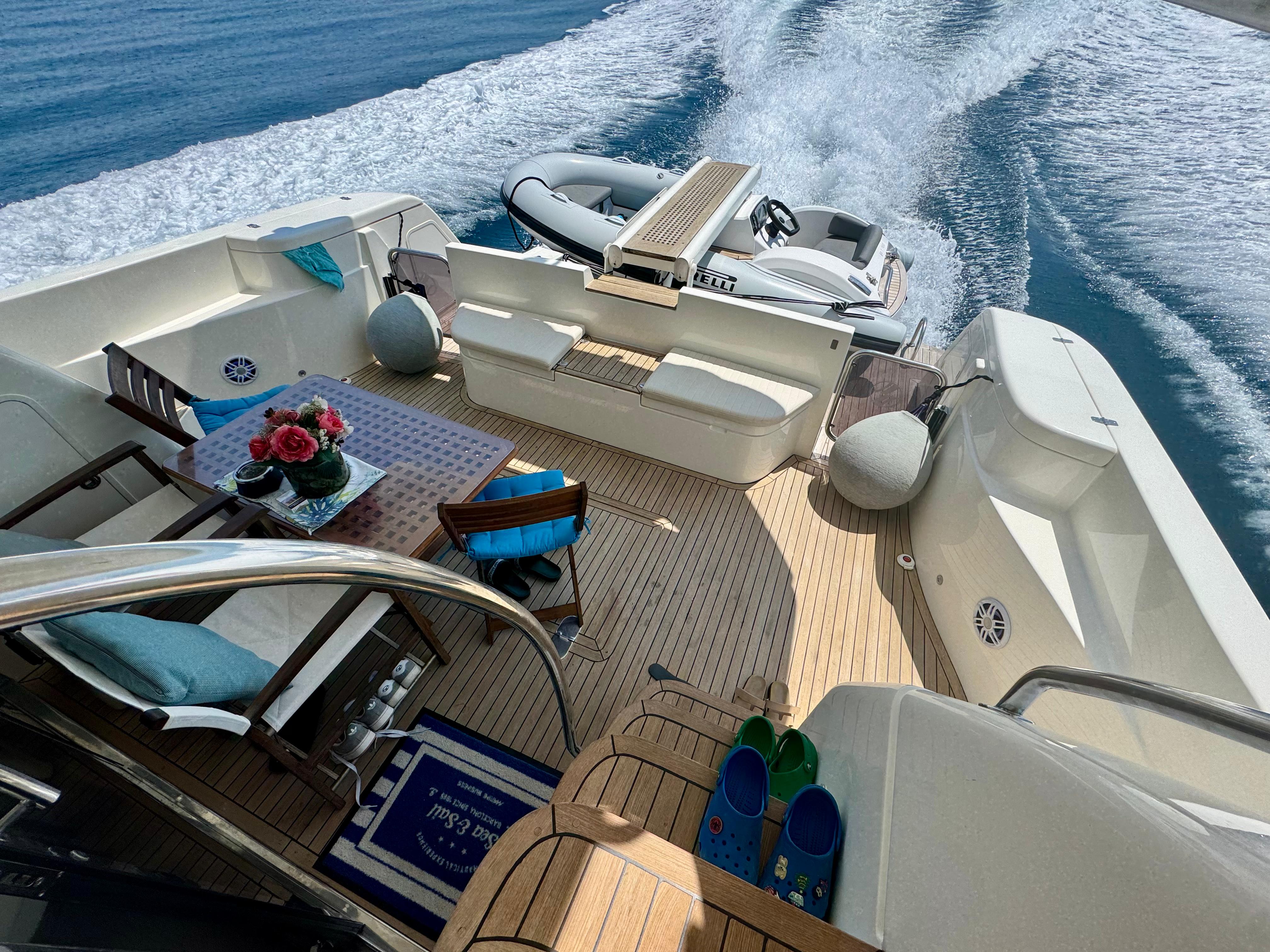 Passerella; tavolo pozzetto; doccia pozzetto; pozzetto in teak. Scaletta bagno idraulica. Bimini-Top; copertura per flybridge. Zattera di salvataggio.