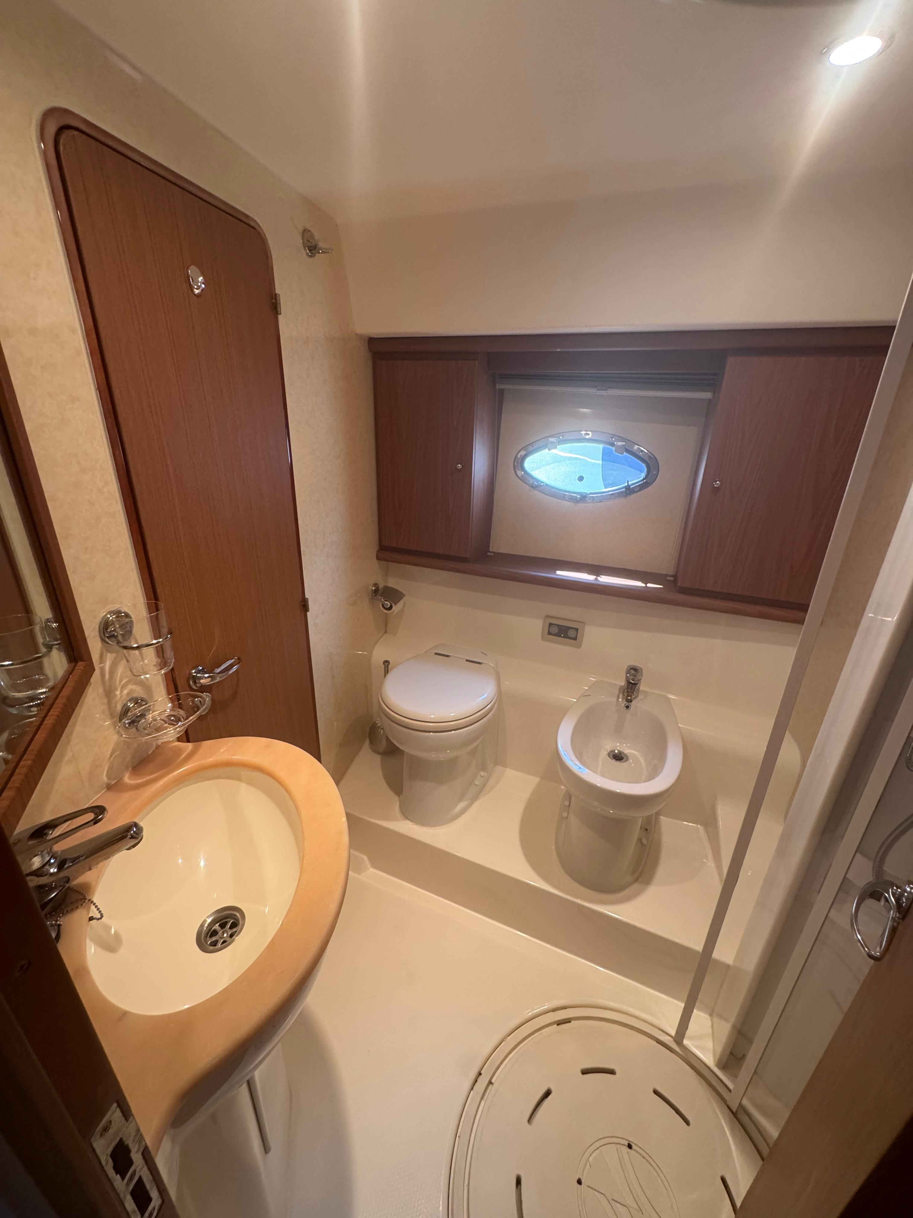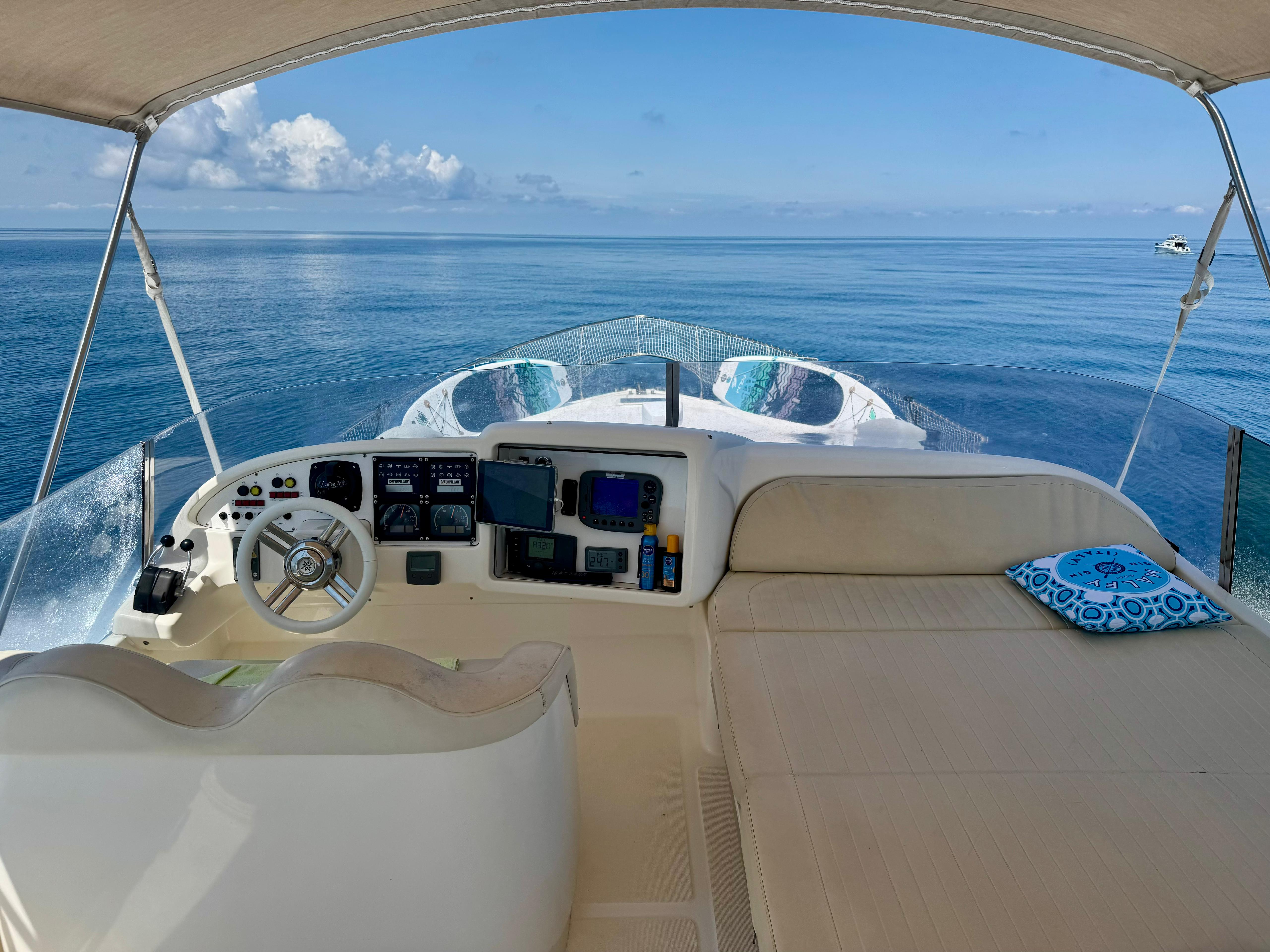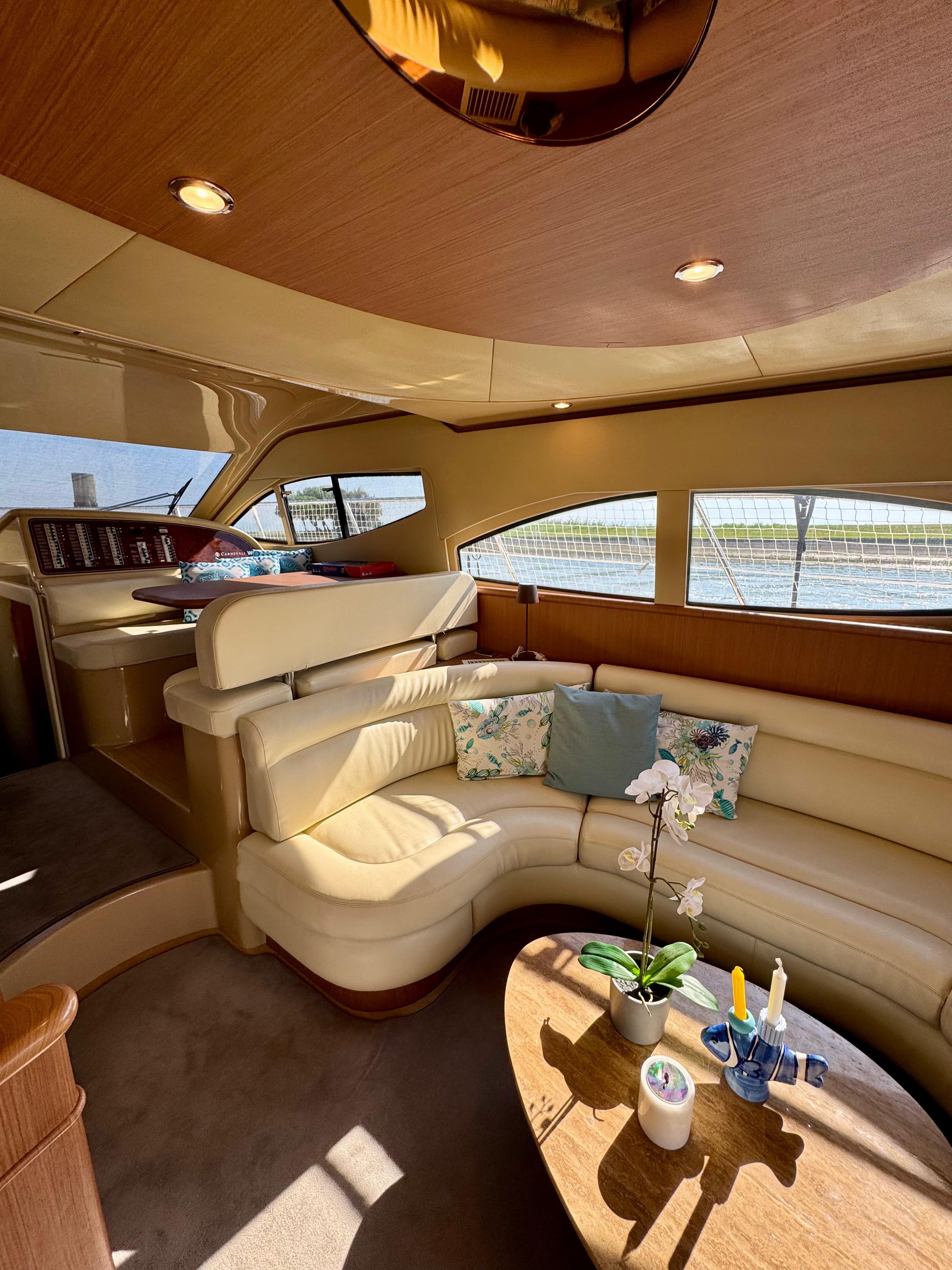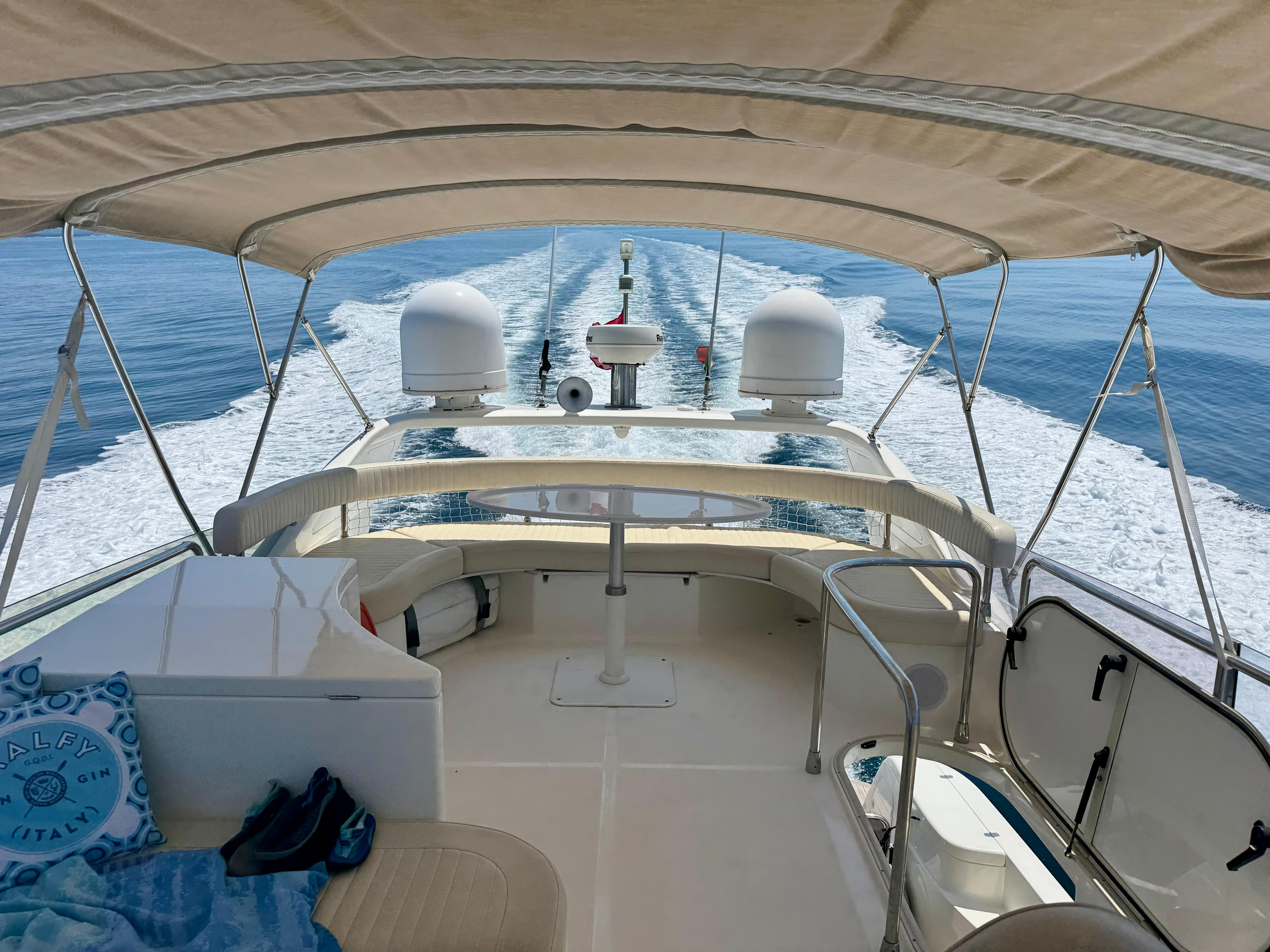 Passerella; tavolo pozzetto; doccia pozzetto; pozzetto in teak. Scaletta bagno idraulica. Bimini-Top; copertura per flybridge. Zattera di salvataggio.