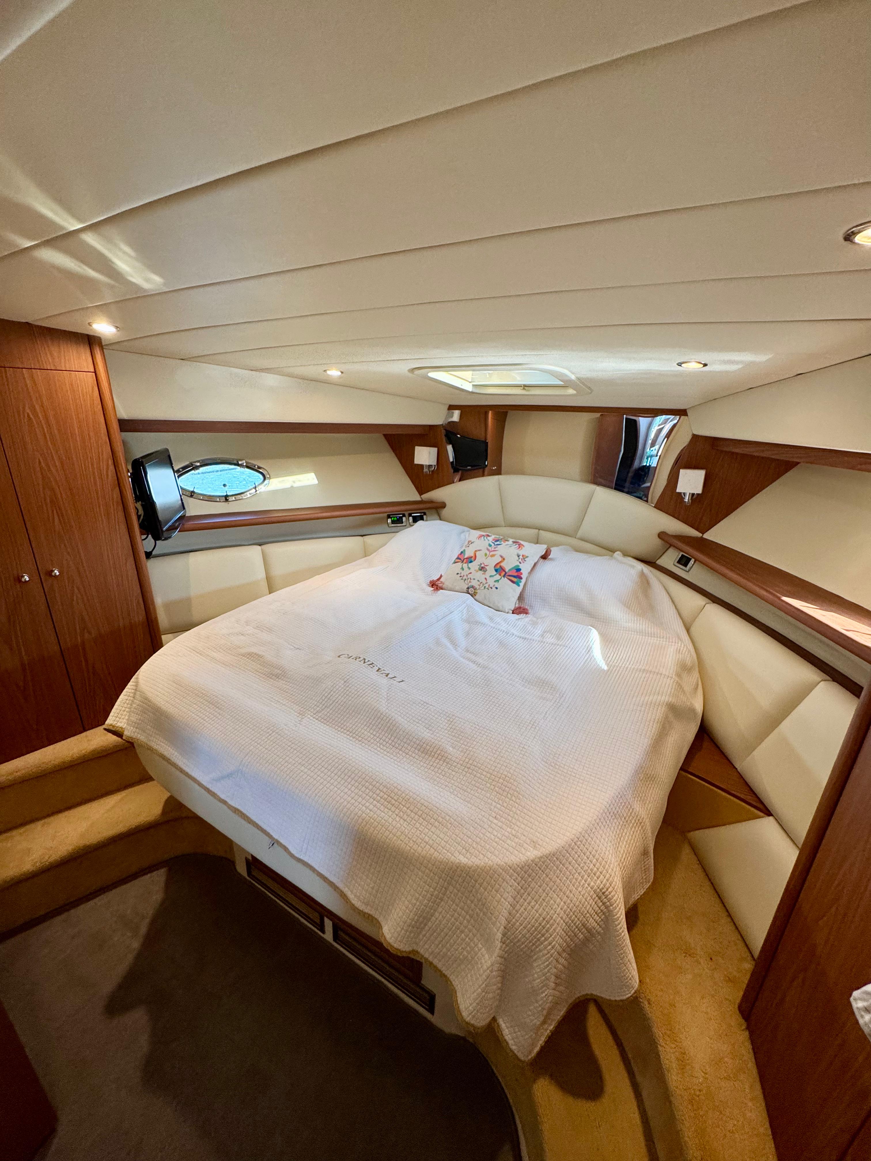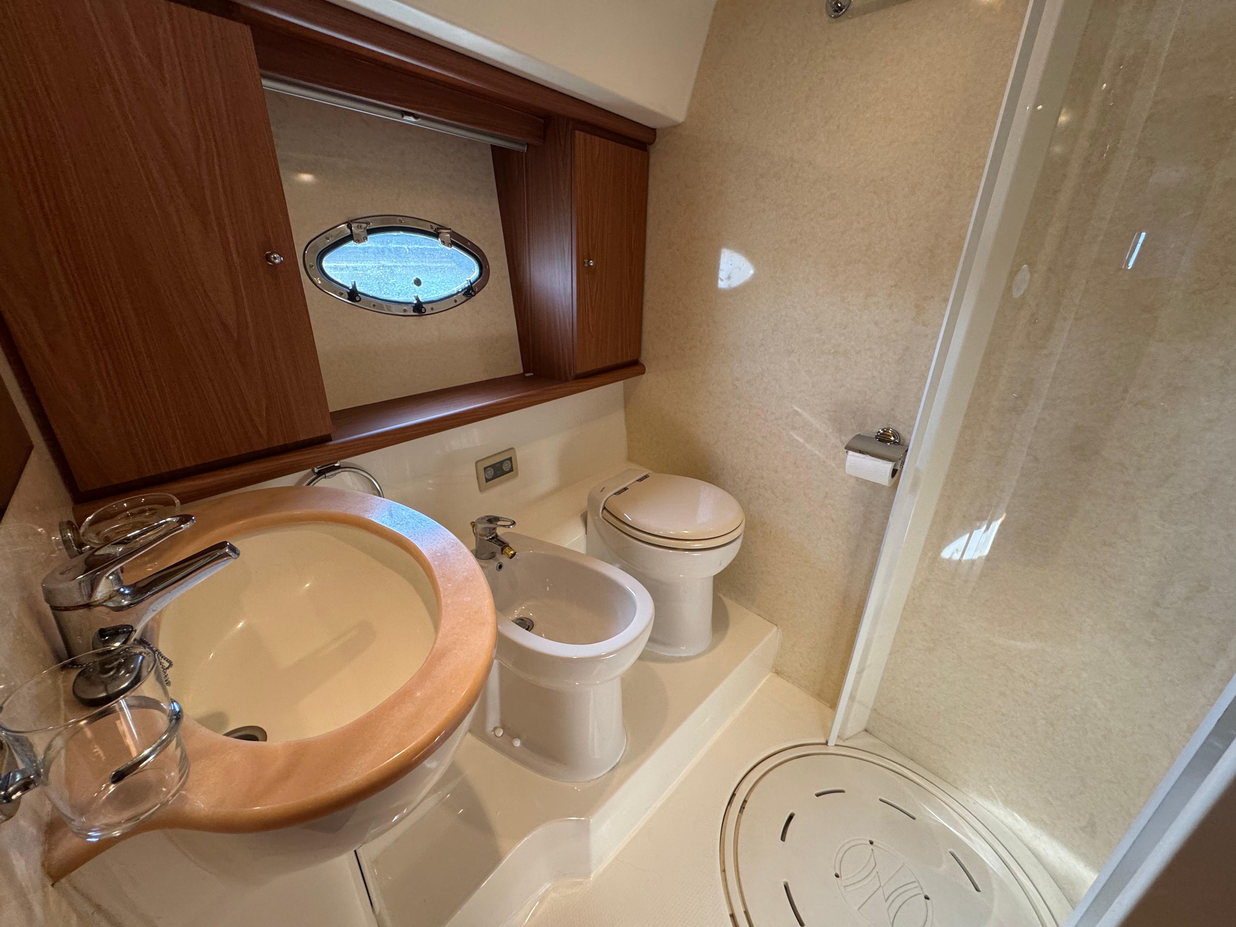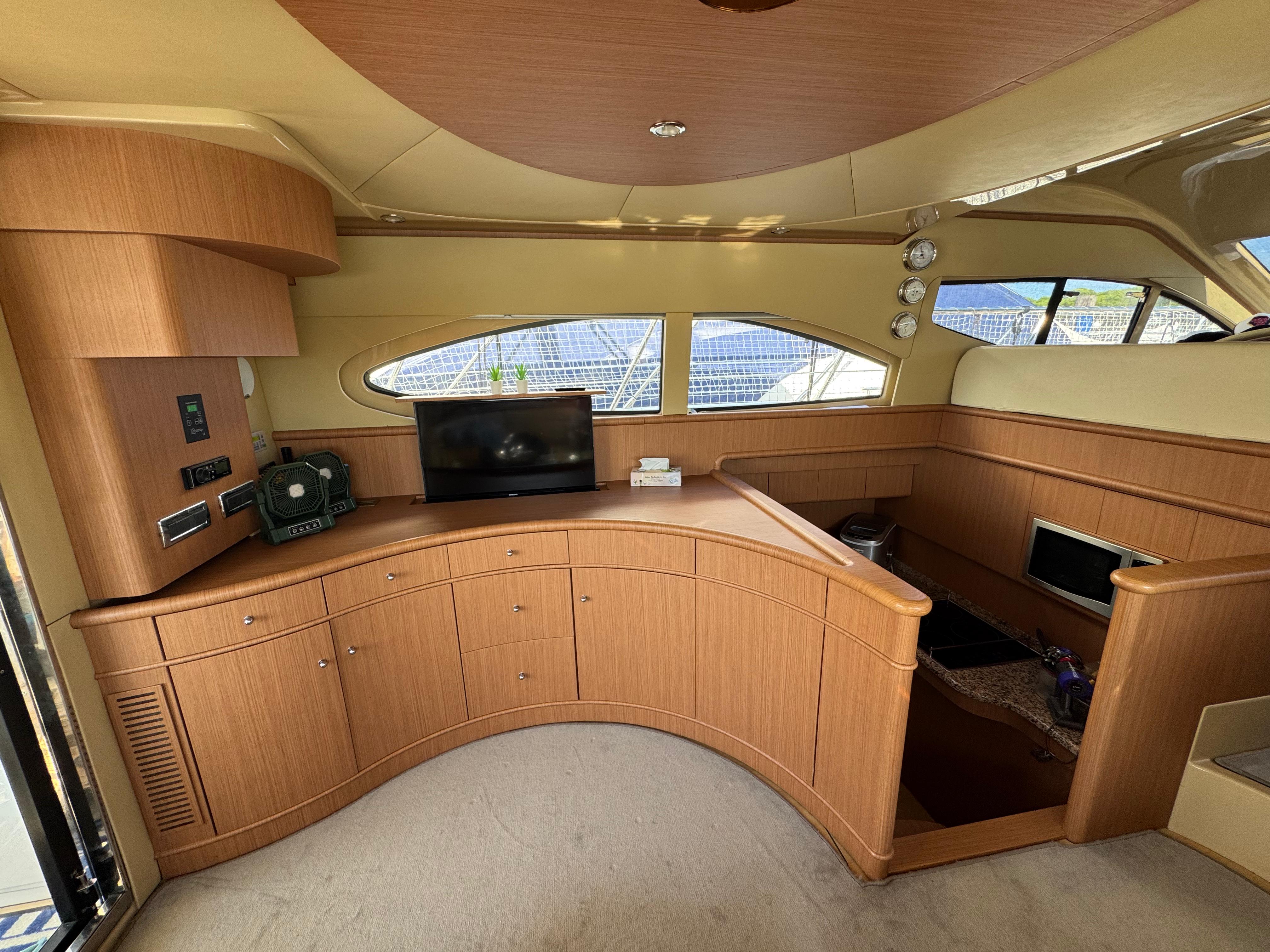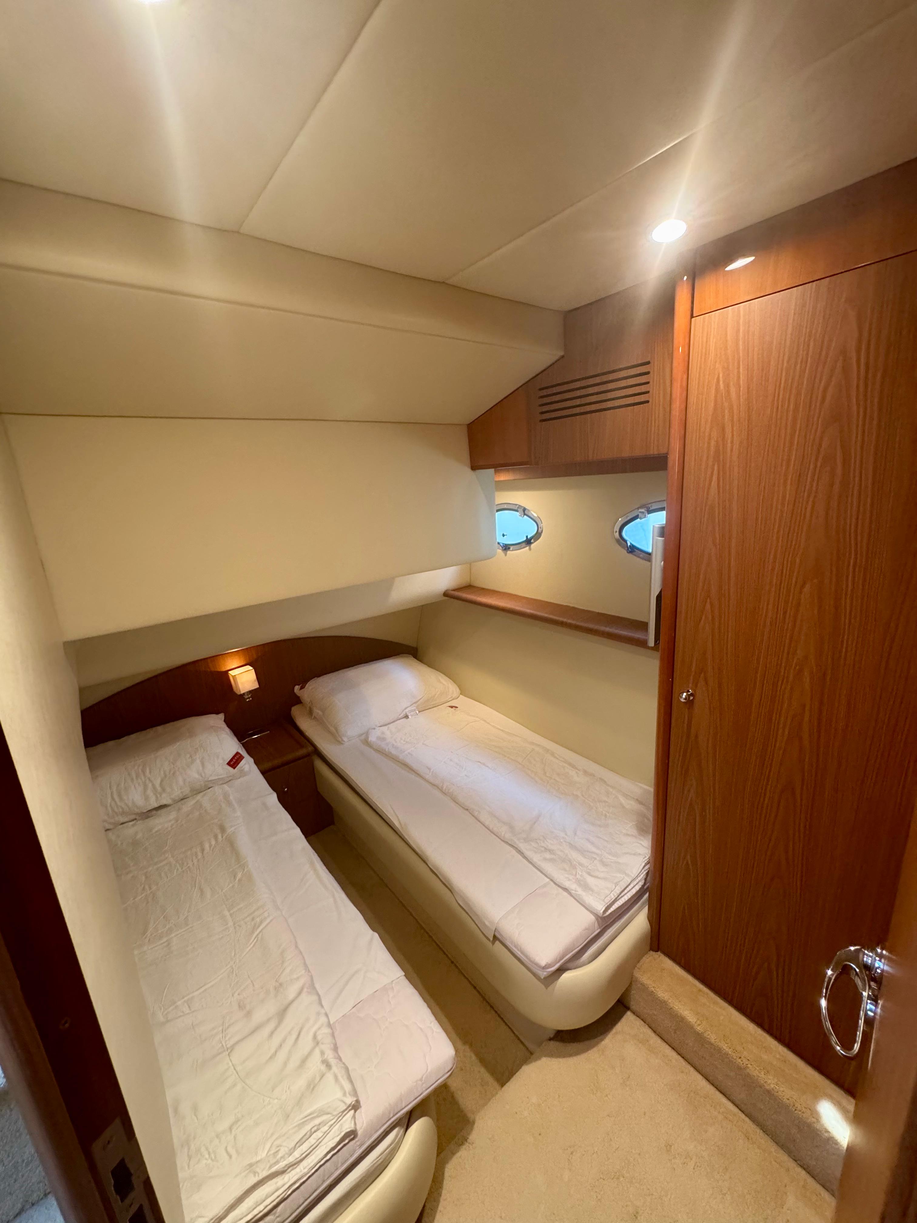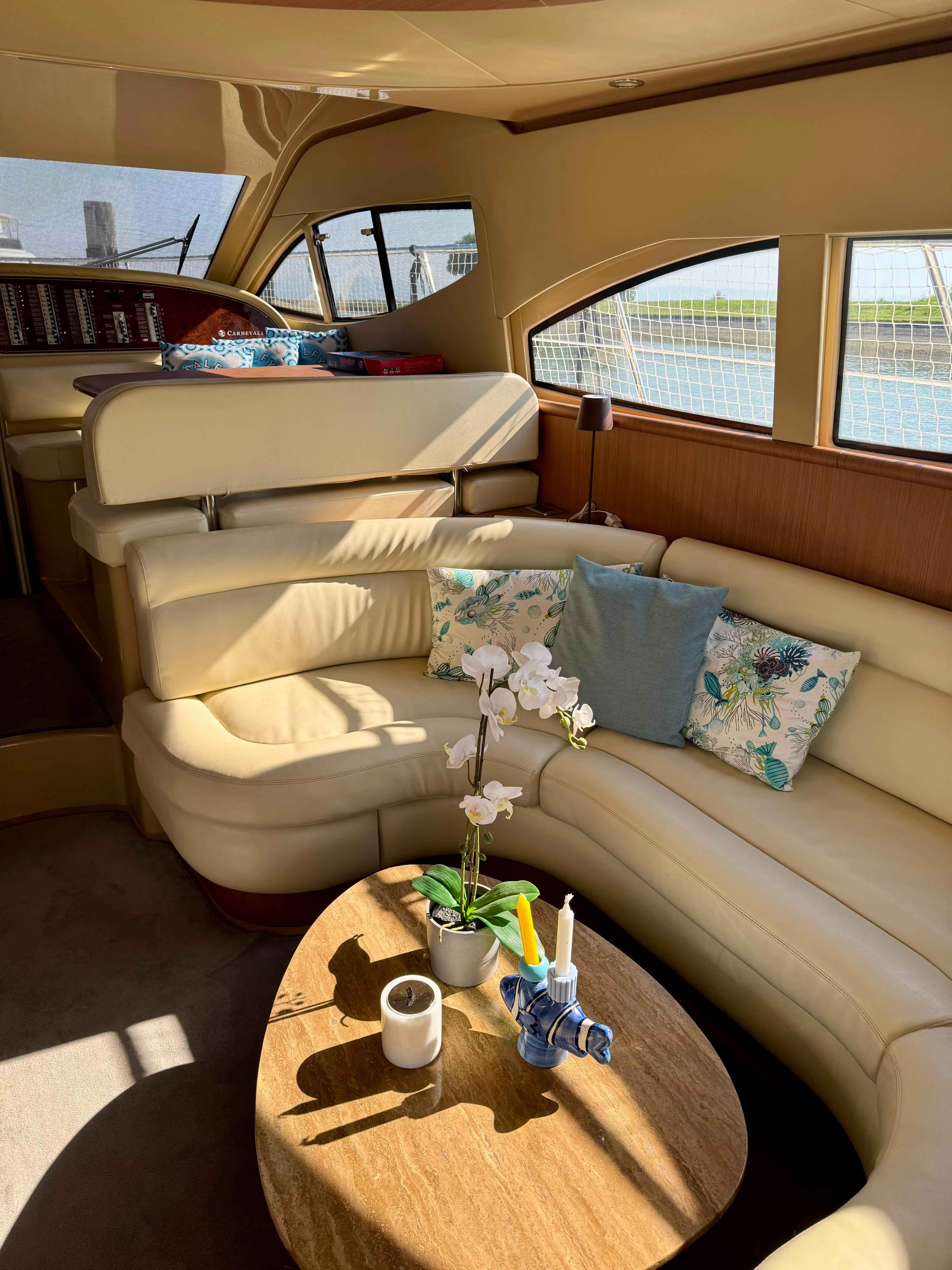 Passerella; tavolo pozzetto; doccia pozzetto; pozzetto in teak. Scaletta bagno idraulica. Bimini-Top; copertura per flybridge. Zattera di salvataggio.